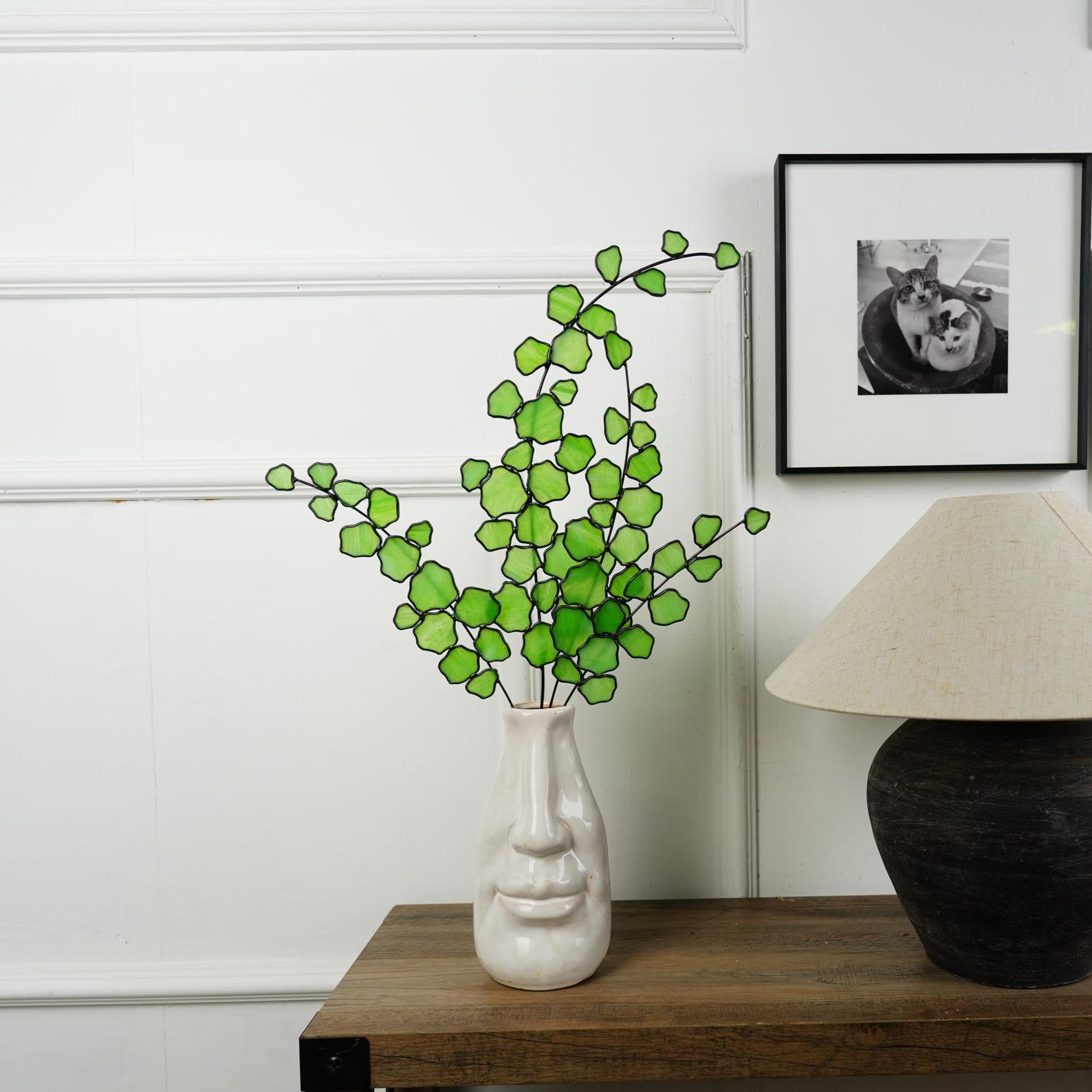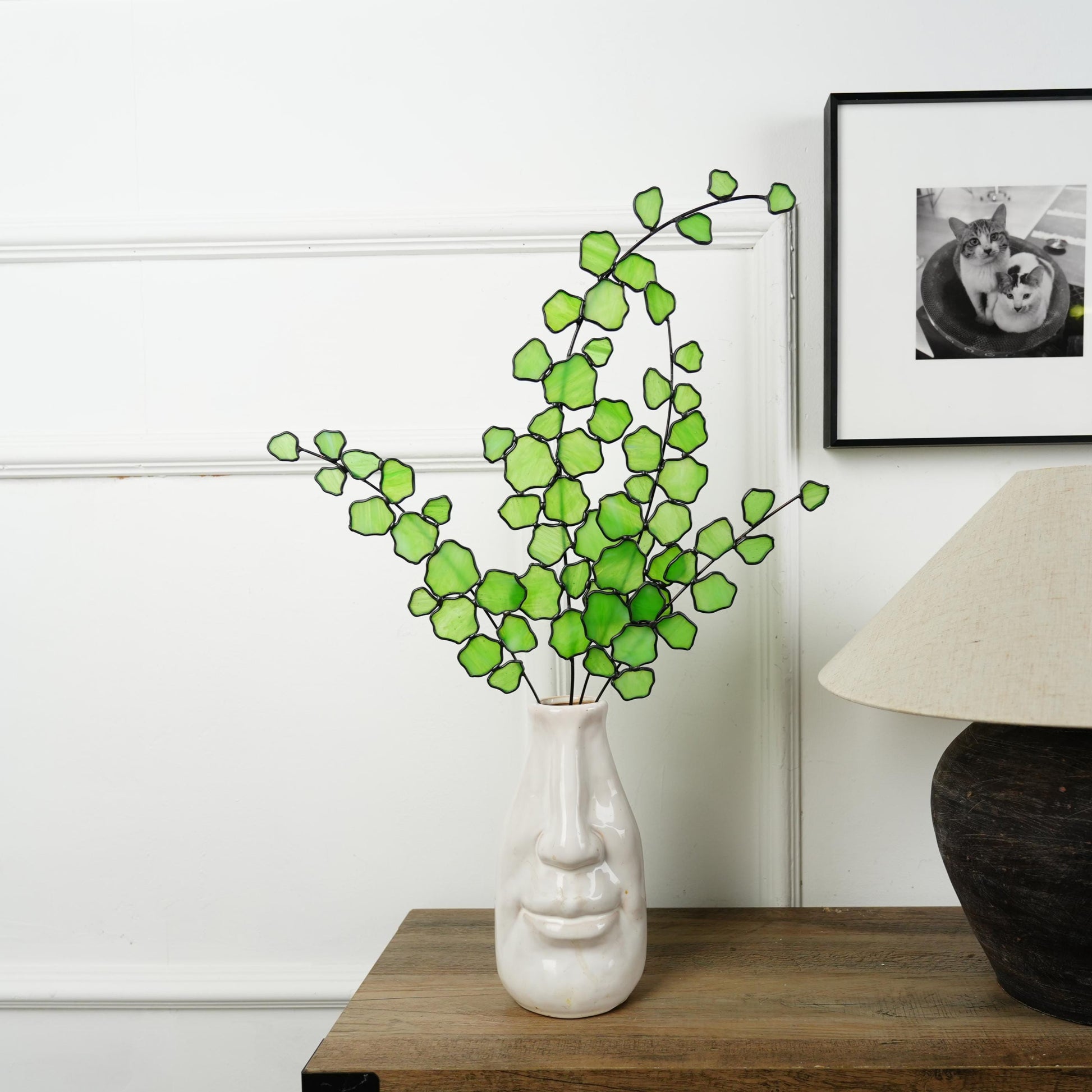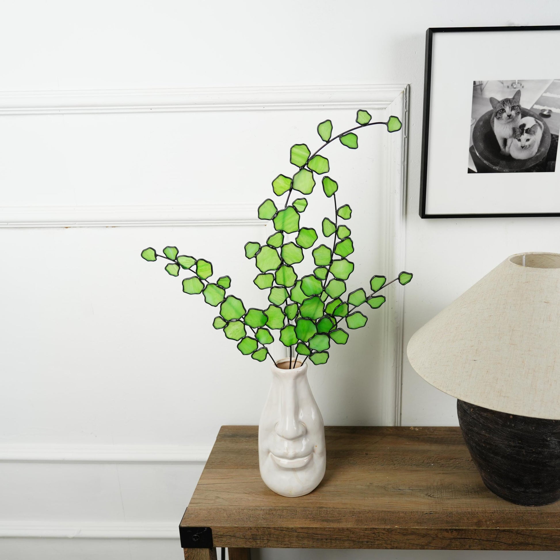 Please note that the vase is not included. The arrangement is made by soldering four Bells of ireland stems together, weighing about 1 lb. A heavy vase is recommended to keep it stable and well balanced.