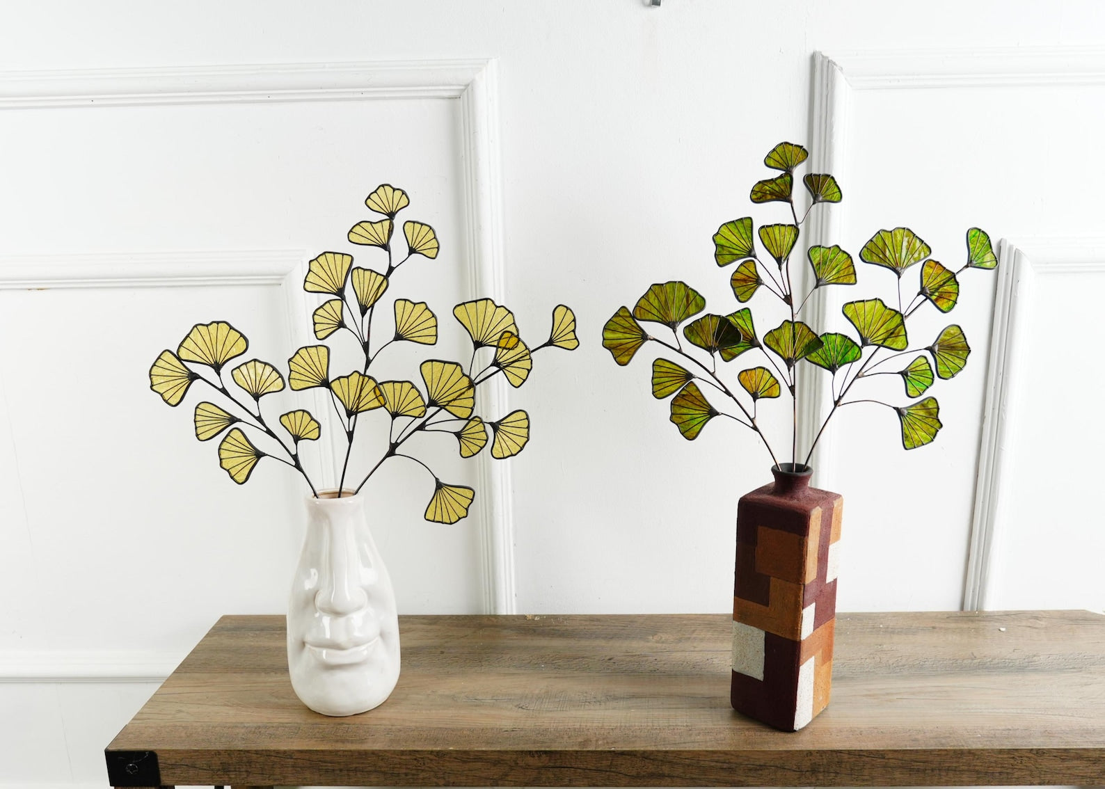 I soldered three ginkgo stems together to form one piece. It’s a bit top-heavy, so you’ll need a heavier vase with a narrow opening to keep it balanced. The glass is soldered using copper wire. We offer two colors: yellow and dark green.
