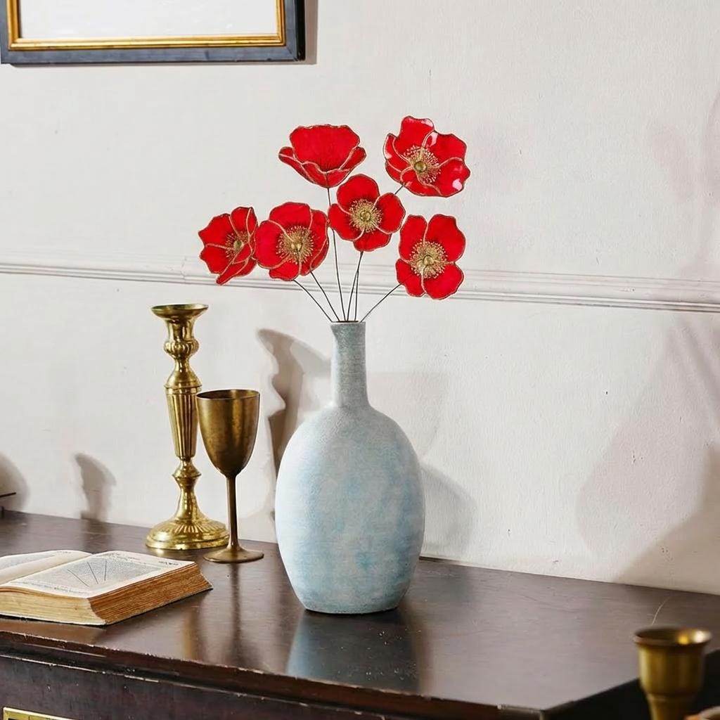 Handmade California Poppy Stained Glass Bouquet, Set of 6 Decorative Faux Flowers, Home Decor