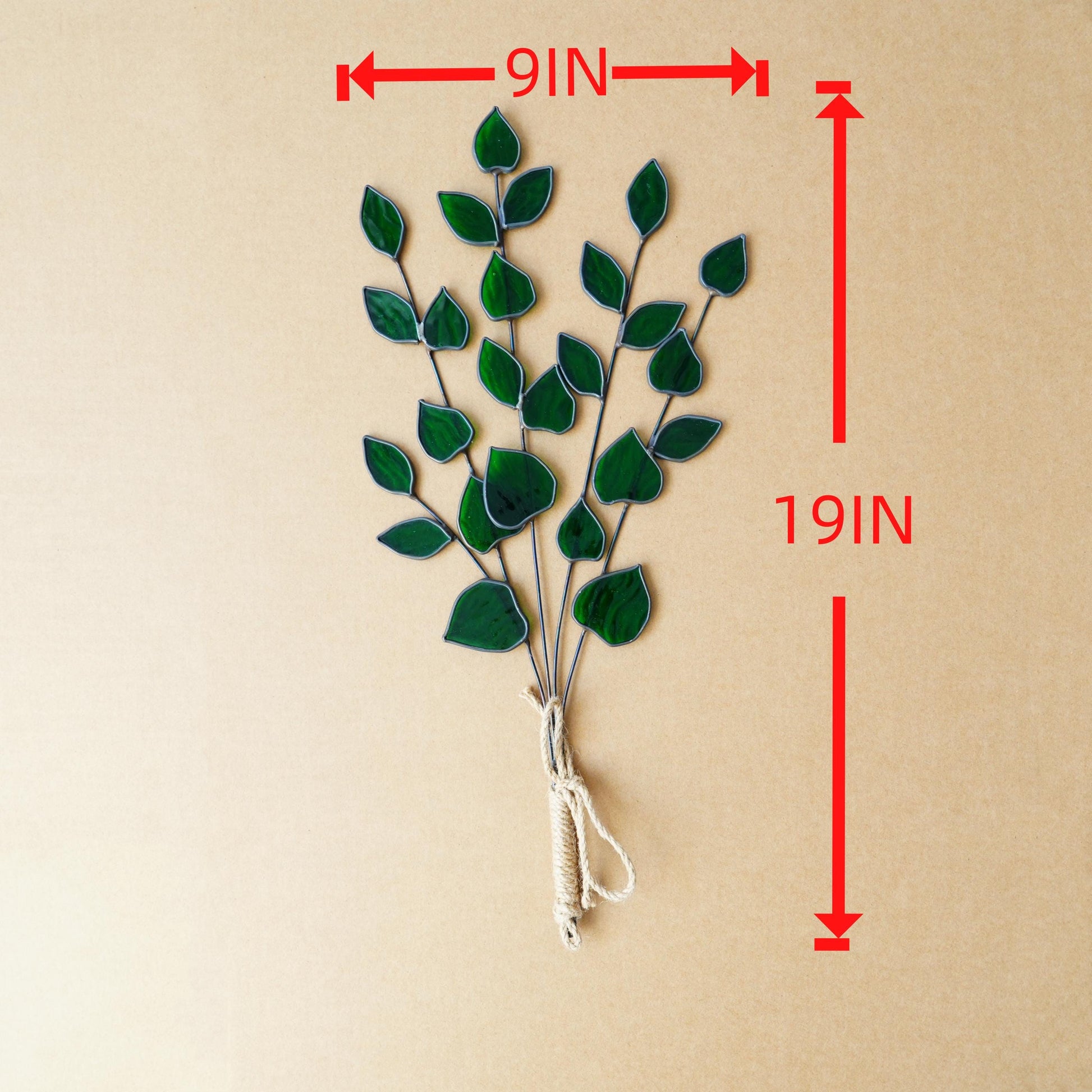 Four green leafy branches are carefully soldered together, with natural jute twine wrapped around the base. It can be displayed in a vase or hung upside down on a wall or window for decoration.